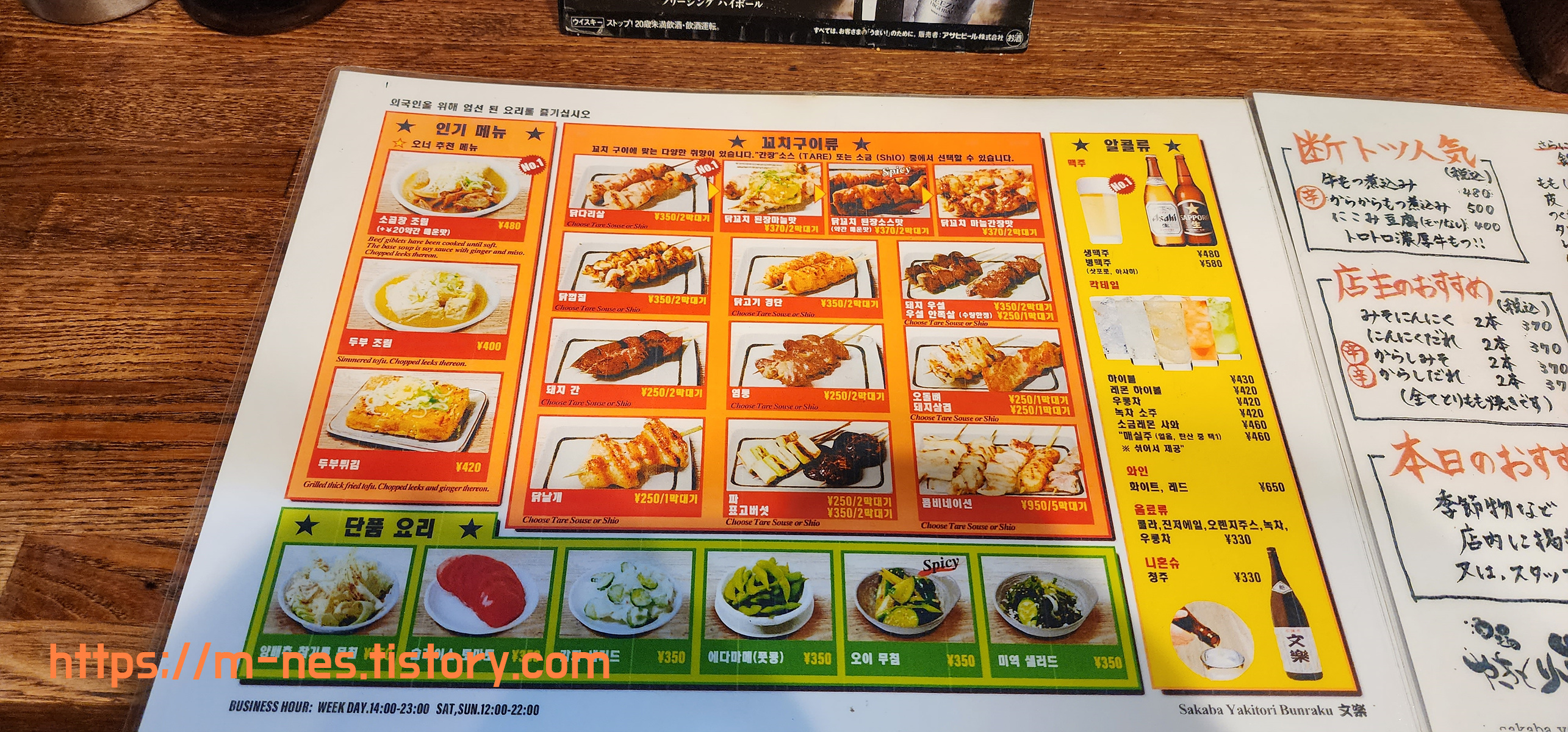 한국어 메뉴하고 가격은 똑같다.