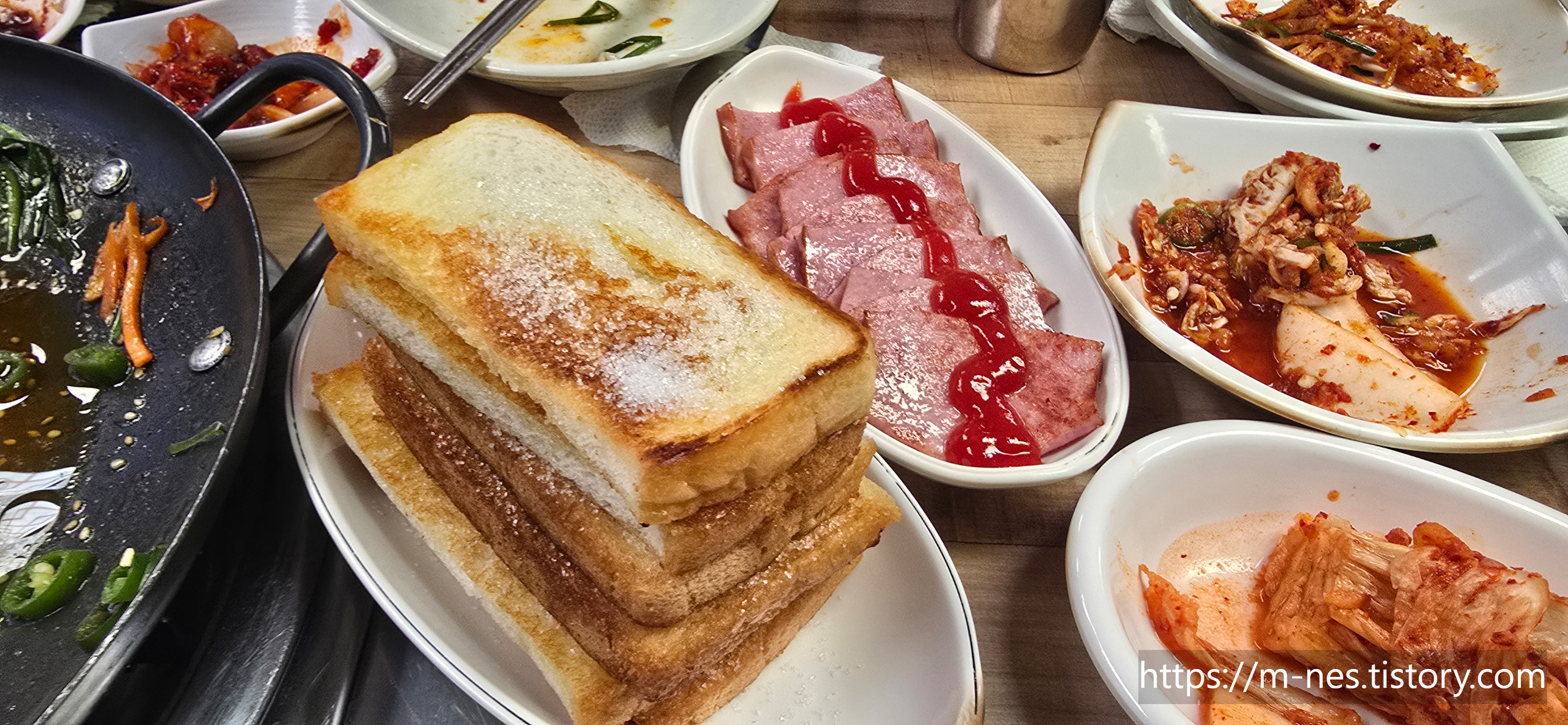 서비스로 나온 햄구이와 설탕토스트.