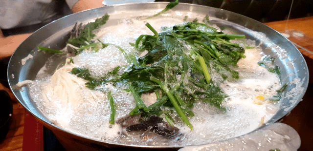 뽀얗게 복어 뼈 머리에서 우러나오는